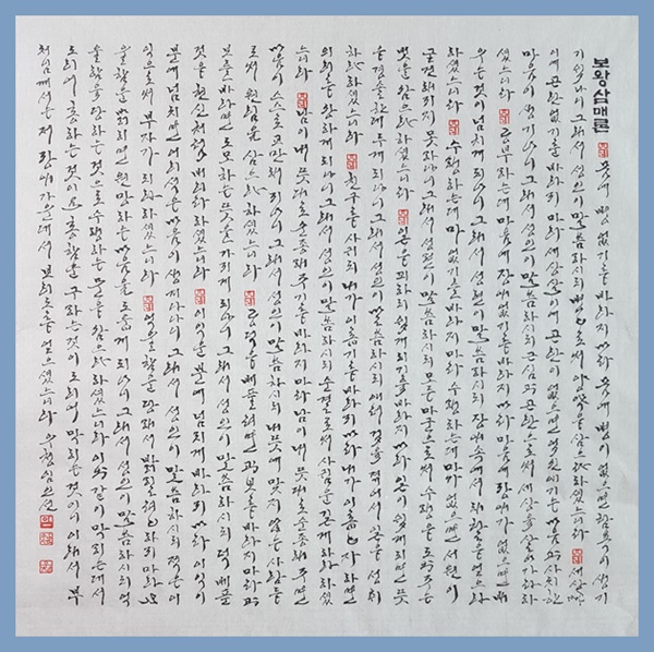 보왕삼매론(寶王三昧論)을 한글서예 민체로 작업하였다.